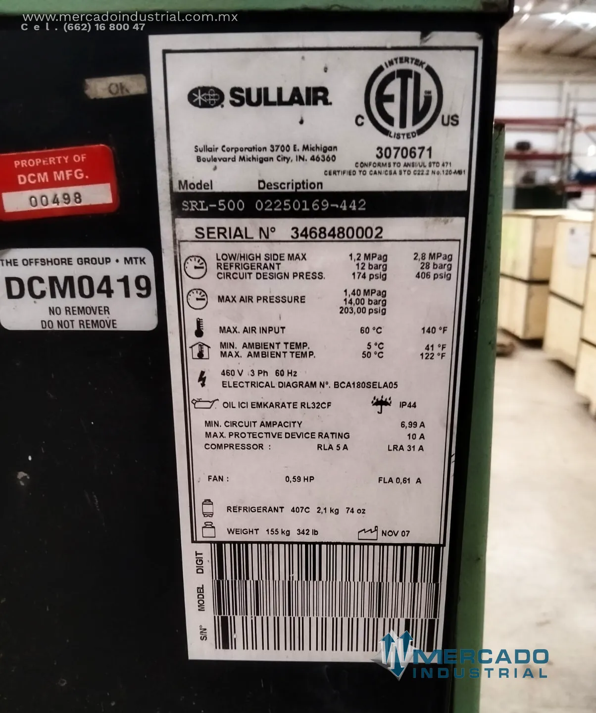 Secador de aire refrigerado 203 PSIG 460V modelo SRL-500 marca SULLAIR - Mercado Industrial