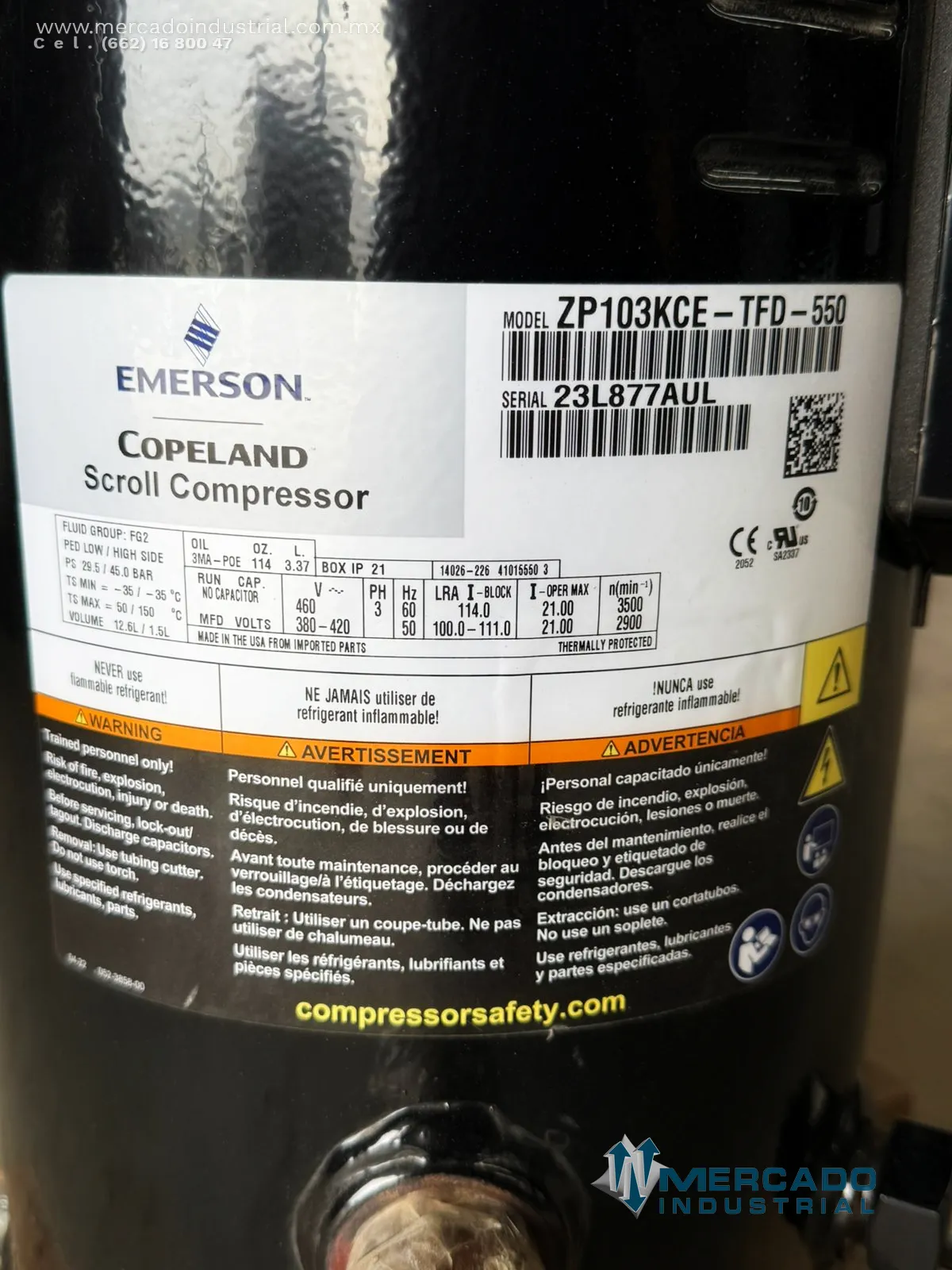 Compresor de espiral trifásico 450 PSI 460 V modelo ZP103KCE-TDF-550 marca COPELAND - Mercado Industrial