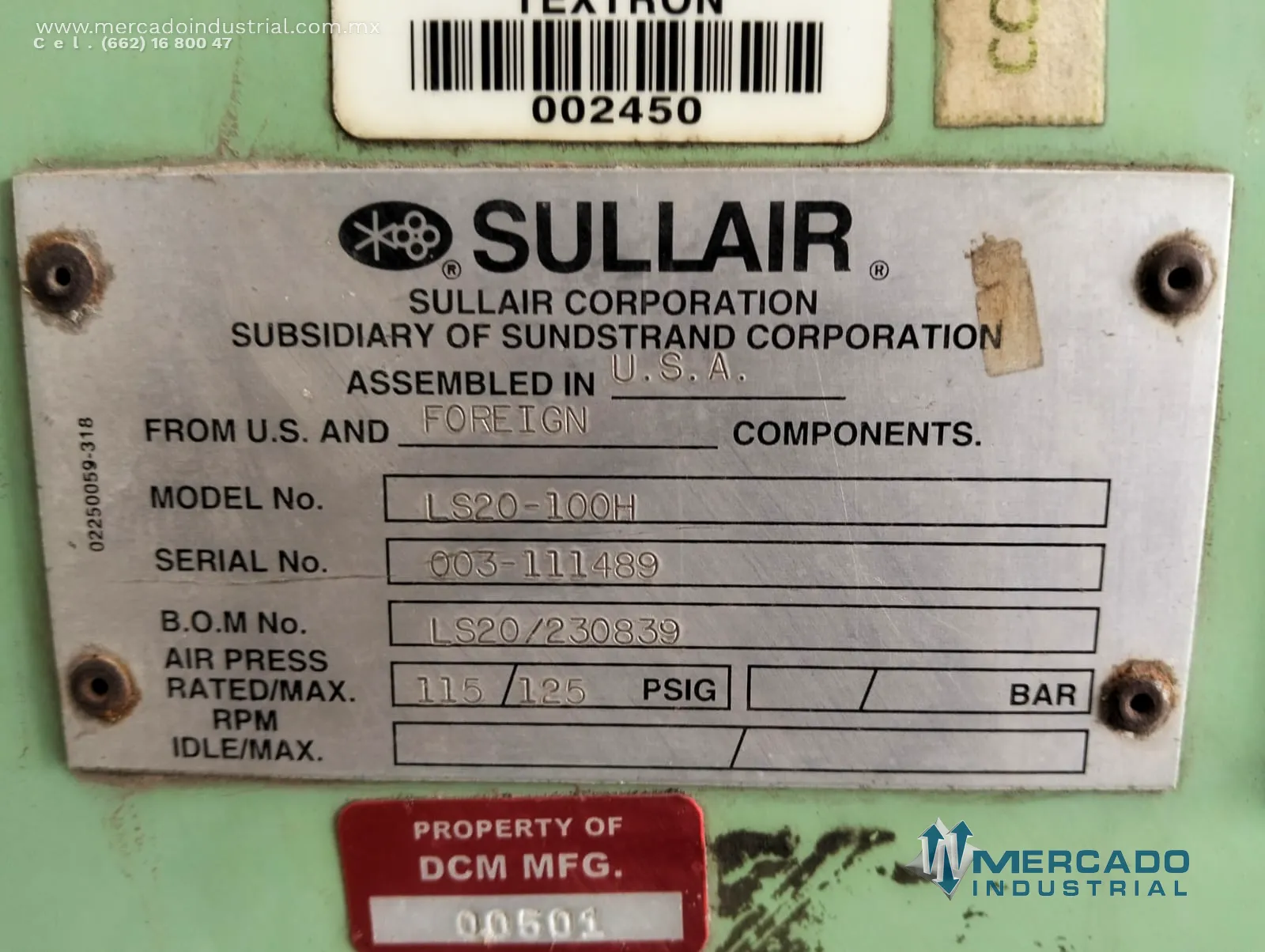 Compresor de aire 100 HP 115/125 PSIG modelo LS20-100H marca SULLAIR - Mercado Industrial