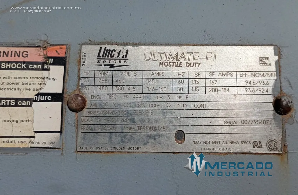 Motor eléctrico 125 HP 4 polos 1785 RPM marca Lincoln Motors - Mercado Industrial