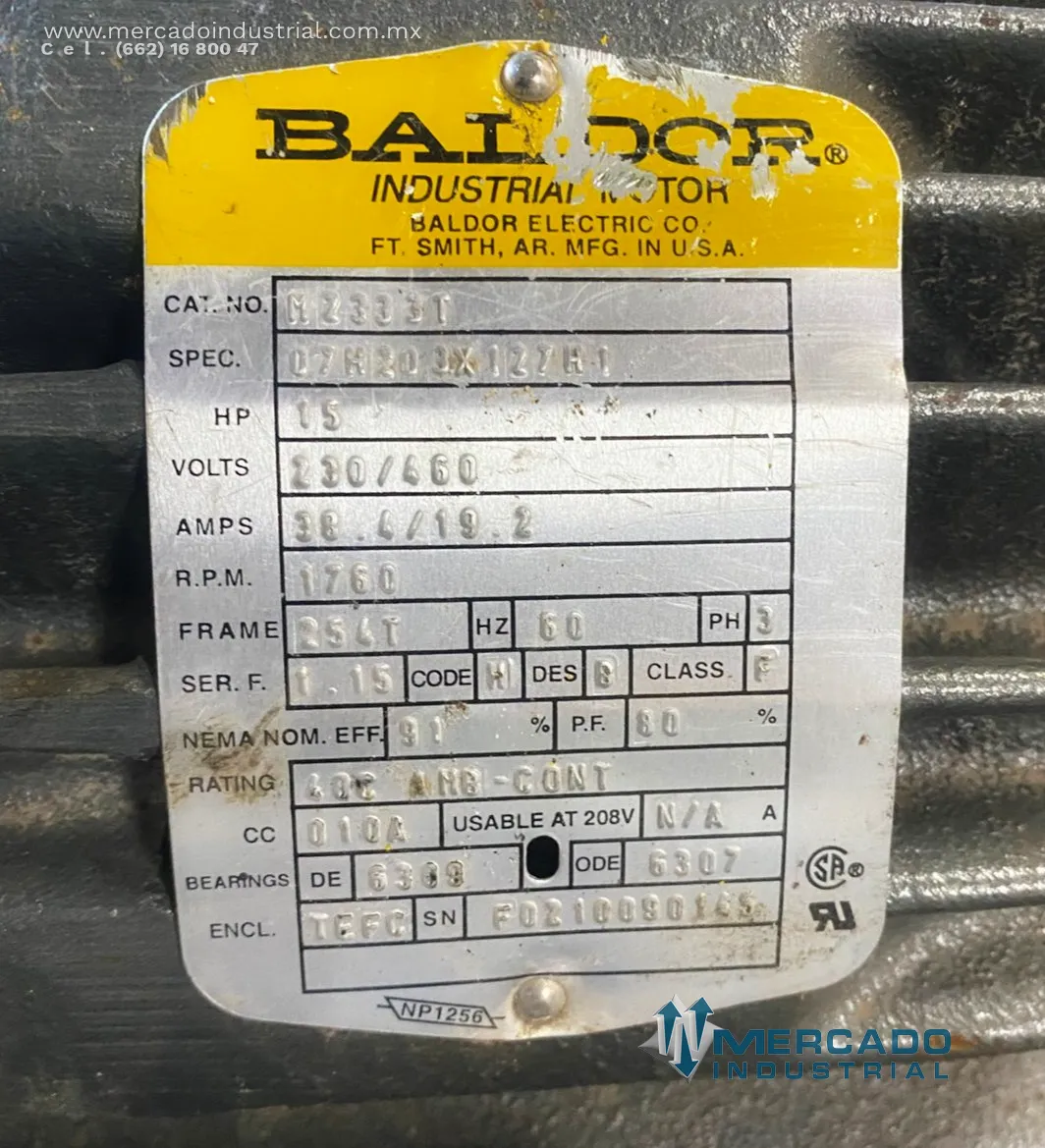 Motor eléctrico 15 HP 4 polos 1760 RPM marca Baldor - Mercado Industrial