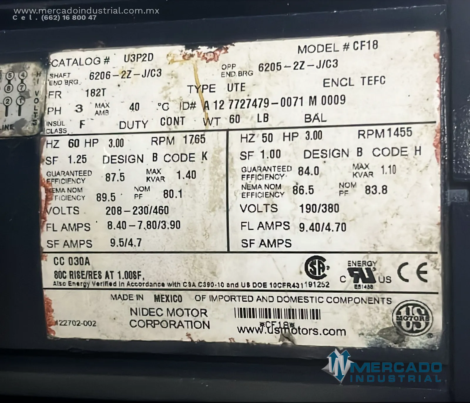 Motor eléctrico 3 HP 4 polos 1765 RPM marca US MOTORS - Mercado Industrial