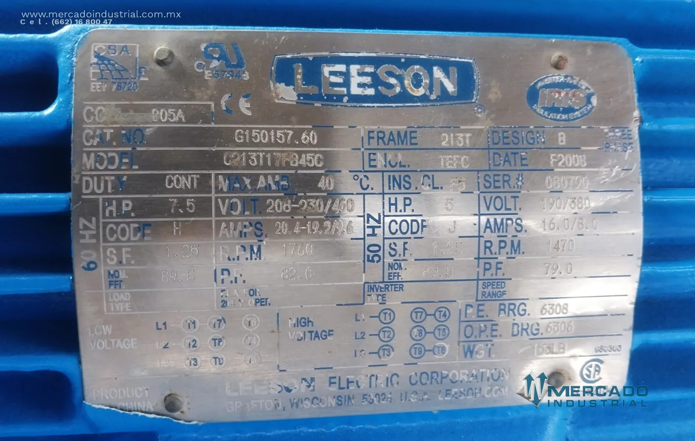 Motor eléctrico 7.5 HP 4 polos 1760 RPM marca LEESON - Mercado Industrial