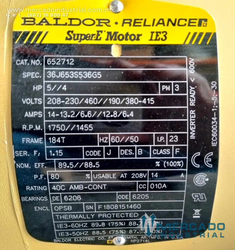 Motor eléctrico trifásico 5 HP 2 polos 1750 RPM marca Baldor - Mercado Industrial