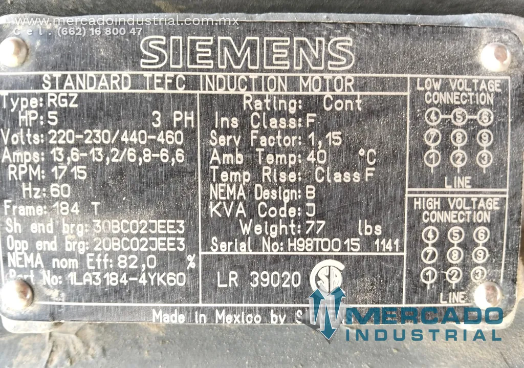 Motor eléctrico trifásico 5 HP 4 polos 1715 RPM marca Siemens - Mercado Industrial