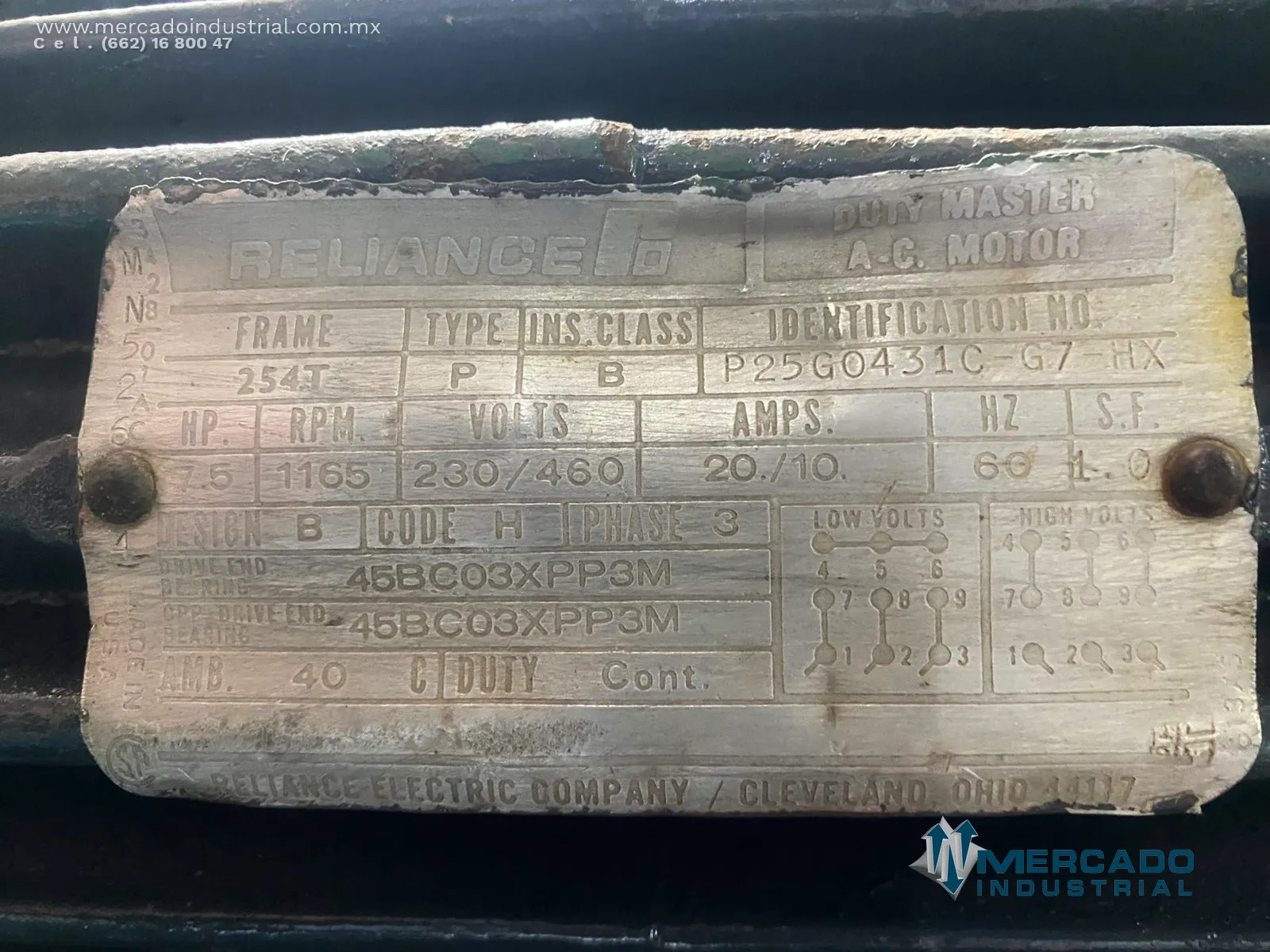 Motor eléctrico trifásico 7.5 HP 6 polos 1165 RPM marca Reliance - Mercado Industrial