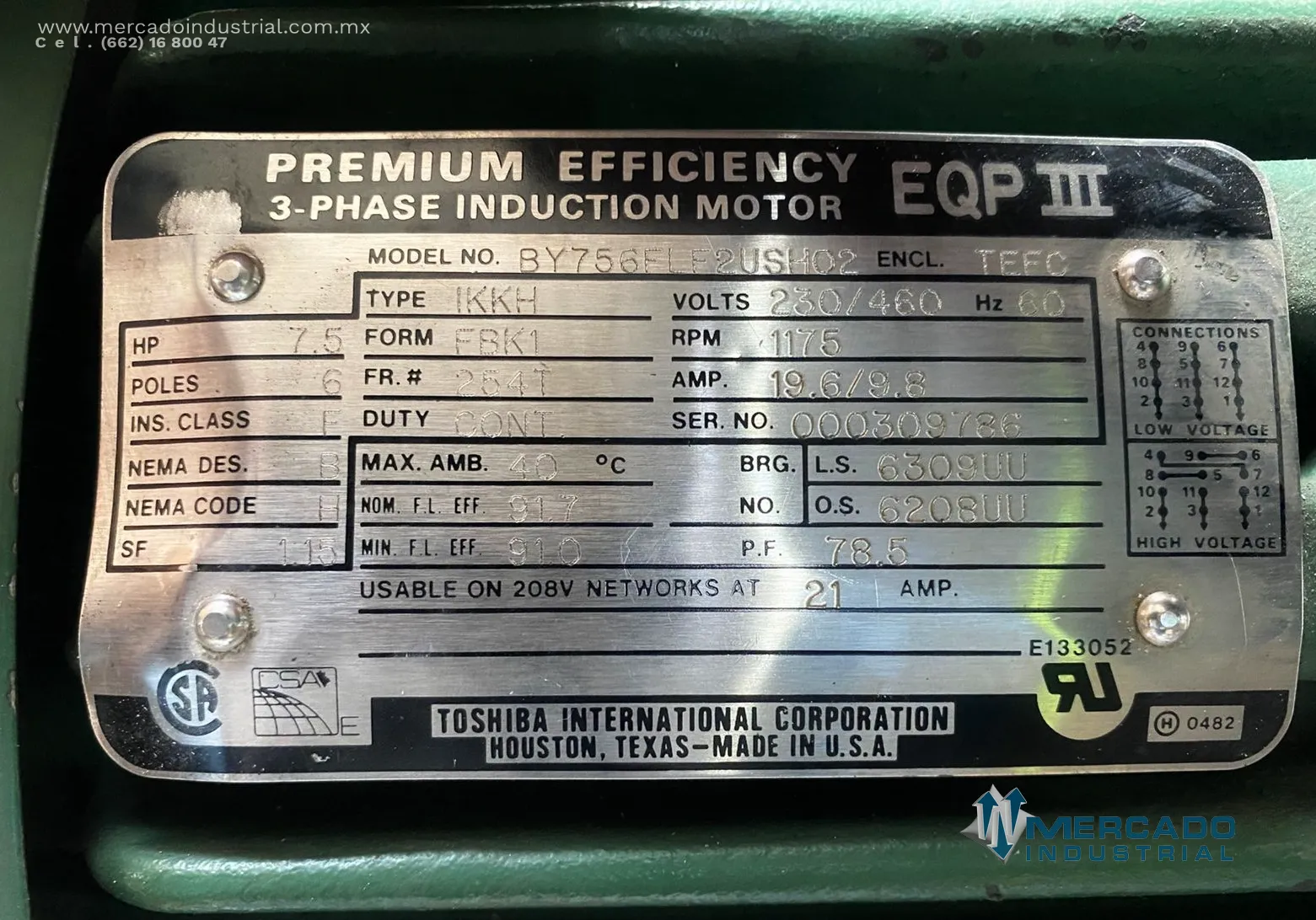 Motor eléctrico trifásico 7.5 HP 6 polos 1175 RPM marca Toshiba - Mercado Industrial