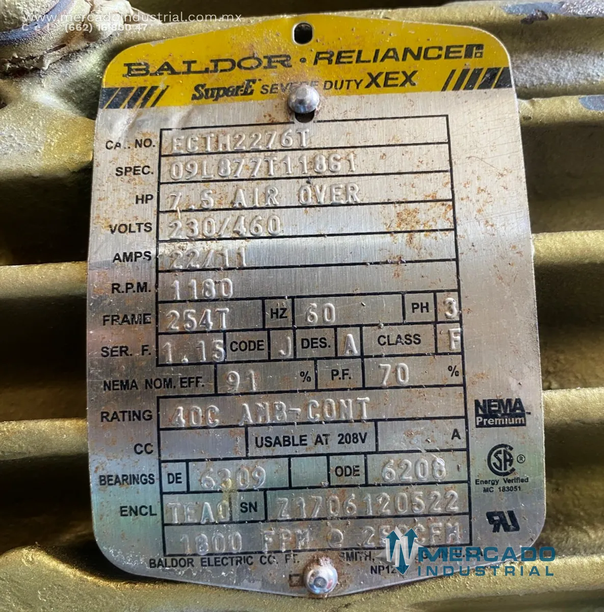 Motor eléctrico trifásico 7.5 HP 6 polos 1180 RPM marca BALDOR-RELIANCE - Mercado Industrial