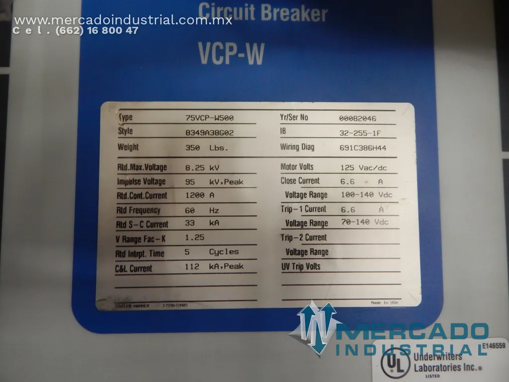 Silleta interruptor 1200 AMP 8.25 kV modelo 75VCP-W500 marca Cutler Hammer - Mercado Industrial